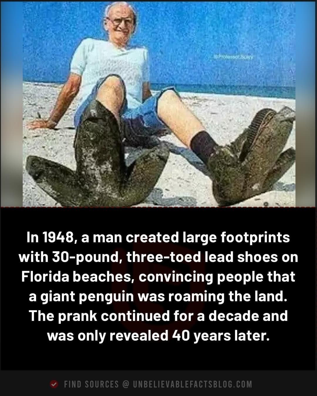 A man had crafted 30-pound lead shoes shaped like enormous penguin feet and secretly wandered the beaches at night, leaving behind the legendary โmonster tracks.โ For over a decade, the prank fooled thousands, fueling endless debates and ghostly tales of the โFlorida Penguin.โ It wasnโt until 40 years later that the hoax was finally revealed โ and the world laughed at one of the most elaborate pranks in history. ๐ญ๐พ