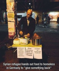 Under the dim lights of a German street, a man stands behind a small folding table with pots of warm food, bread, and a handwritten sign that reads: “Give Something Back to German People.” 🌙✨ That man is a Syrian refugee — someone who once fled war, fear, and uncertainty — now offering comfort to those who have little left.
