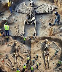 The discovery was made in a remote archaeological site, where ancient carvings nearby depict winged deities descending from the skies. These engravings suggest a civilization that held divine connections or perhaps revered hybrid beings. The imagery evokes powerful questions: Could this skeletal giant be the source of angelic myths that have permeated cultures for millennia? Was it a being that once walked the Earth, worshiped by those who believed it to be a messenger of the gods?