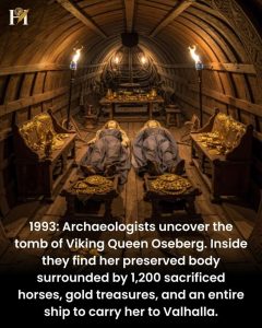 Inside the beautifully preserved wooden ship, over 70 feet long, lay the remains of two noble women โ believed to be Queen ร sa of Oseberg and her handmaiden โ surrounded by extravagant treasures, intricate carvings, textiles, and ceremonial items. ๐๐ Among these were sacrificed horses, richly decorated wagons, wooden sleighs, tapestries, and countless objects symbolizing wealth, power, and the sacred passage to Valhalla, the eternal hall of heroes. ๐๐ฅ