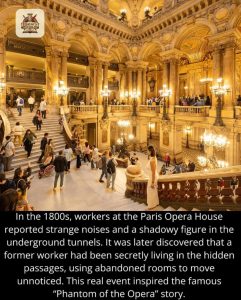 What they discovered was stranger than fiction. A former worker, disfigured and shunned by society, had been secretly living in the hidden passages beneath the Opera House. πŸ•―οΈ Using abandoned rooms and forgotten tunnels, he built a secret world β€” a home carved from silence, sorrow, and song. His life in the shadows, unseen yet deeply felt, would later inspire Gaston Leroux’s immortal tale, β€œThe Phantom of the Opera.” πŸŽΆπŸ’”