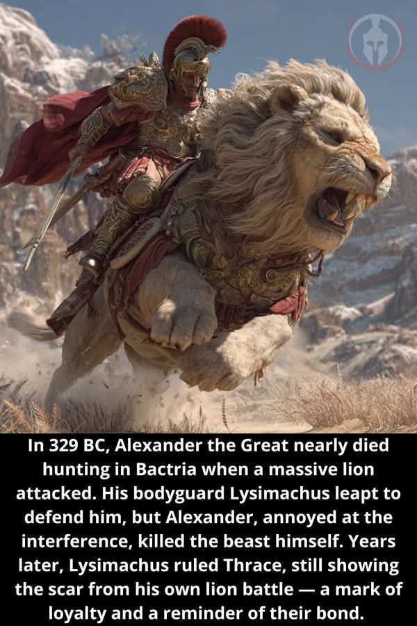 In 329 BC, amid the harsh wilderness of Bactria, a young king faced death โ not on the battlefield, but in the jaws of a lion. ๐๏ธ The great Alexander of Macedon, already a conqueror of empires, found himself locked in a primal fight for survival when a massive lion lunged from the shadows. His loyal bodyguard, Lysimachus, instinctively rushed to defend his king, sword drawn and heart ablaze with courage. But Alexander, driven by pride and a warriorโs fire, waved him off. With unmatched ferocity, he struck the beast down himself, standing bloodied but unbroken. ๐ฅ