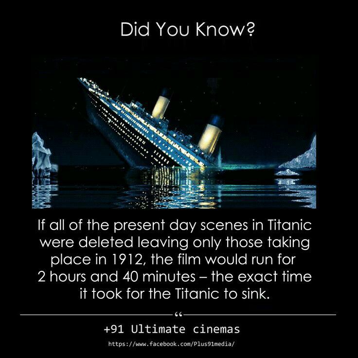 Here’s a chilling yet fascinating fact about James Cameron’s legendary film Titanic (1997) — if all the modern-day scenes were removed, leaving only those set in 1912, the movie would last 2 hours and 40 minutes, the exact amount of time it took for the real Titanic to sink after striking the iceberg. 😢🕰️