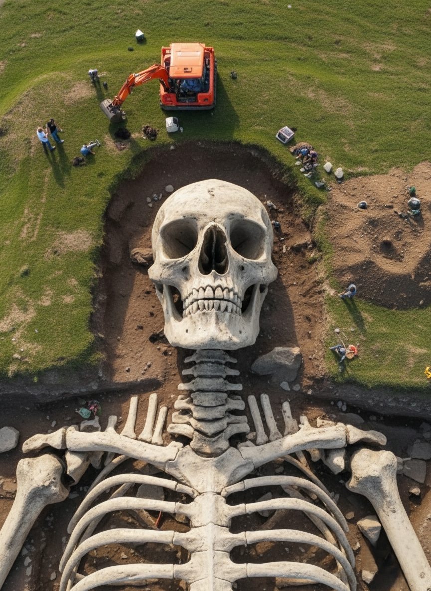 In what could be one of the most explosive archaeological revelations in modern history, researchers have unearthed the towering remains of a colossal human-like figure, buried beneath layers of untouched earth in a remote valley. The discovery — first leaked through anonymous footage showing enormous bones laid out under floodlights — has shattered the boundaries between science, myth, and conspiracy. The skeleton’s proportions are staggering: ribs larger than steel beams, a femur longer than a man’s height, and a skull with cavernous eye sockets that defy any evolutionary explanation. “We’ve never seen anything like this,” one archaeologist was overheard saying before the feed abruptly cut off. Within hours, the site was sealed by unidentified authorities, and communications from the excavation team went dark.
