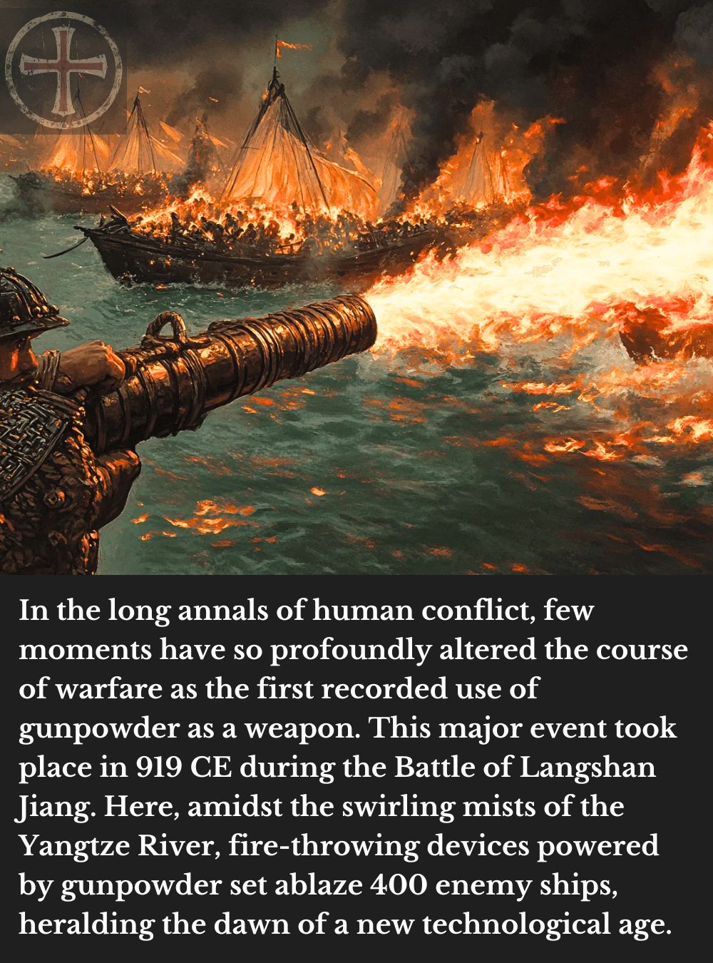 In the chronicles of human history, there are moments that forever change the fate of nations β and one of them was born in fire on the waters of China. ππ₯ The year was 919 CE, and the world stood unknowingly on the edge of a revolution. During the Battle of Langshan Jiang, amid the swirling mists of the Yangtze River, Chinese forces unleashed a weapon unlike anything seen before β gunpowder. What began as an experiment in alchemy became a force that would reshape war, empire, and destiny. π₯