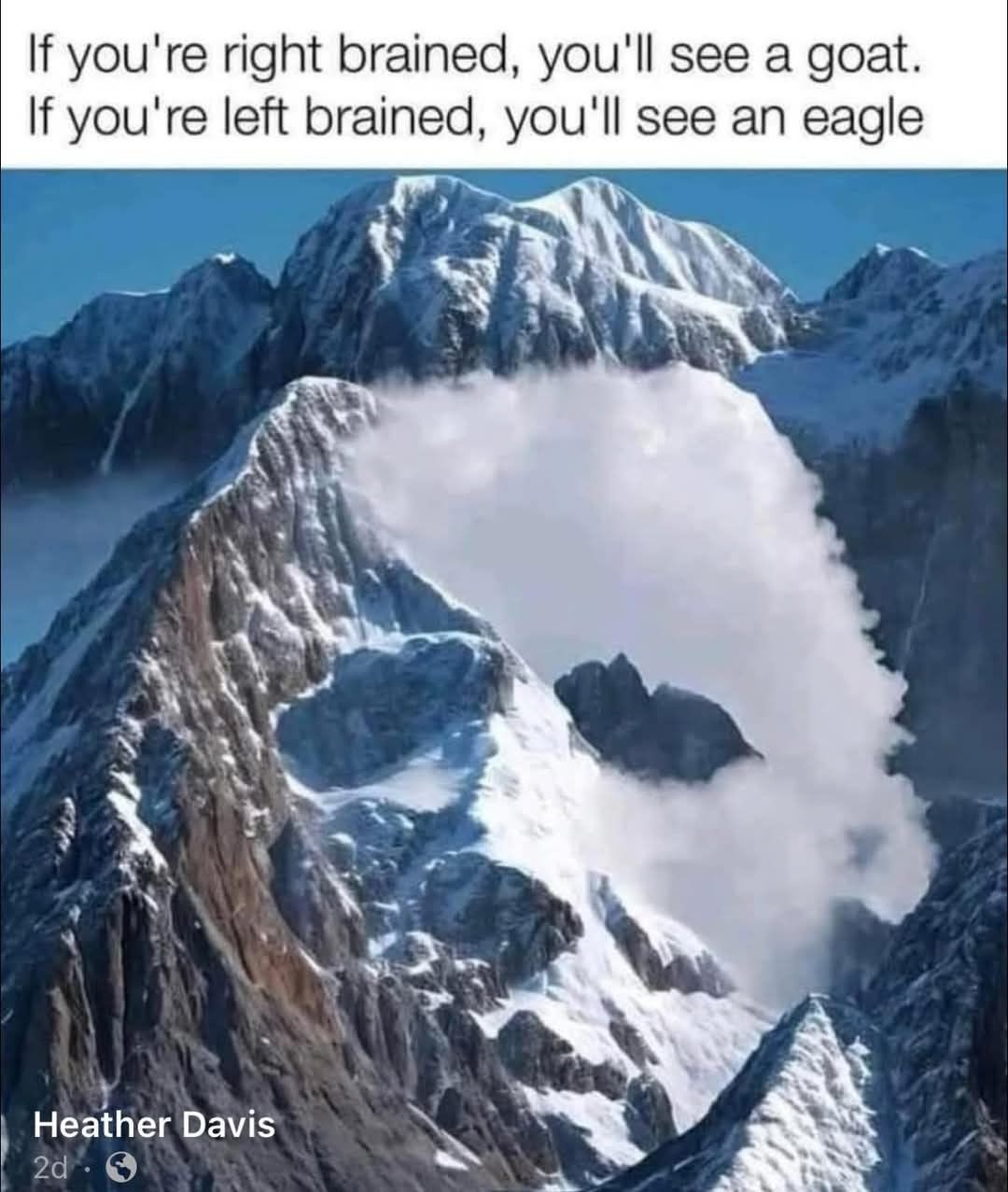 If youโ€™re right-brained, youโ€™re likely more creative, intuitive, and imaginative โ€” and your eyes may first spot the goat, its shape subtly carved into the snowy slopes. ๐Ÿ๐ŸŽจ But if youโ€™re left-brained, more logical and analytical by nature, you might instantly notice the eagle, its wings spread majestically across the mountainโ€™s face. ๐Ÿฆ…๐Ÿ“