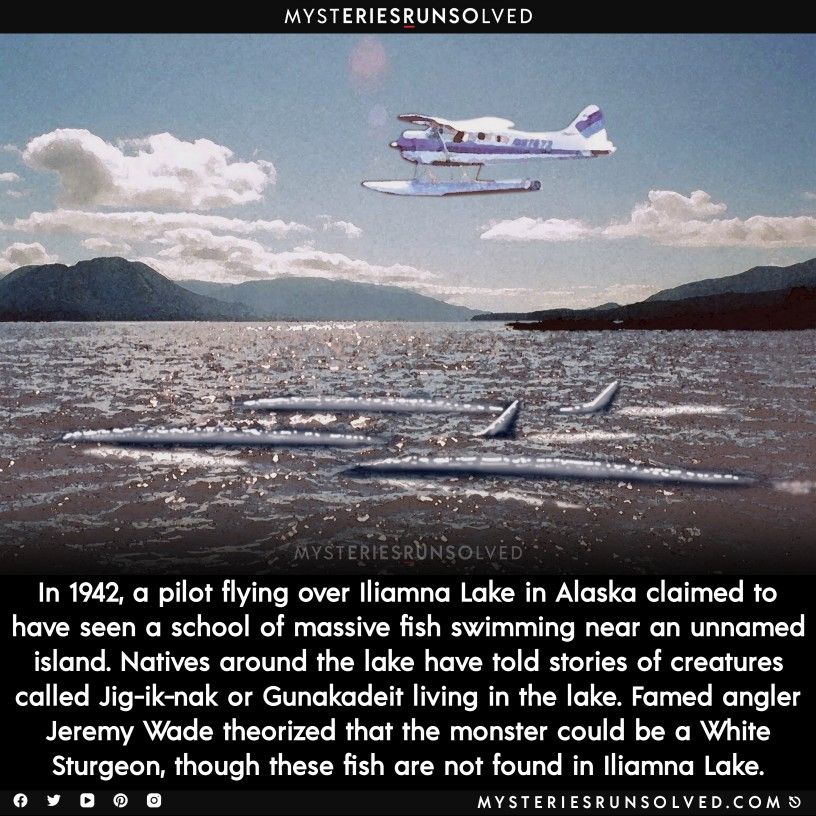 High above the icy wilderness of Alaska in 1942, a pilot flying over Iliamna Lake spotted something that would spark one of the greatest aquatic mysteries in North America. ๐๏ธ๐ฆ Beneath the shimmering surface of the massive lake, he claimed to see giant fish-like creatures โ long, dark, and moving in synchronized formation. The sight was so extraordinary that it quickly became the subject of both fascination and fear. ๐ฎโจ
