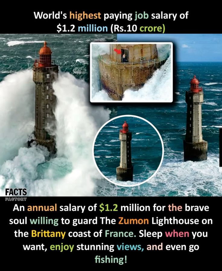 Off the rugged Brittany coast of France, where the Atlantic Ocean roars with unrelenting fury, stands the Zumon Lighthouse β a solitary guardian against the waves. πβ‘ Battling wind, storm, and sea spray, this towering structure offers one of the most dangerous yet mesmerizing jobs in the world β with a staggering salary of $1.2 million per year (about βΉ10 crore) for the brave soul who dares to take it. πΌπͺ