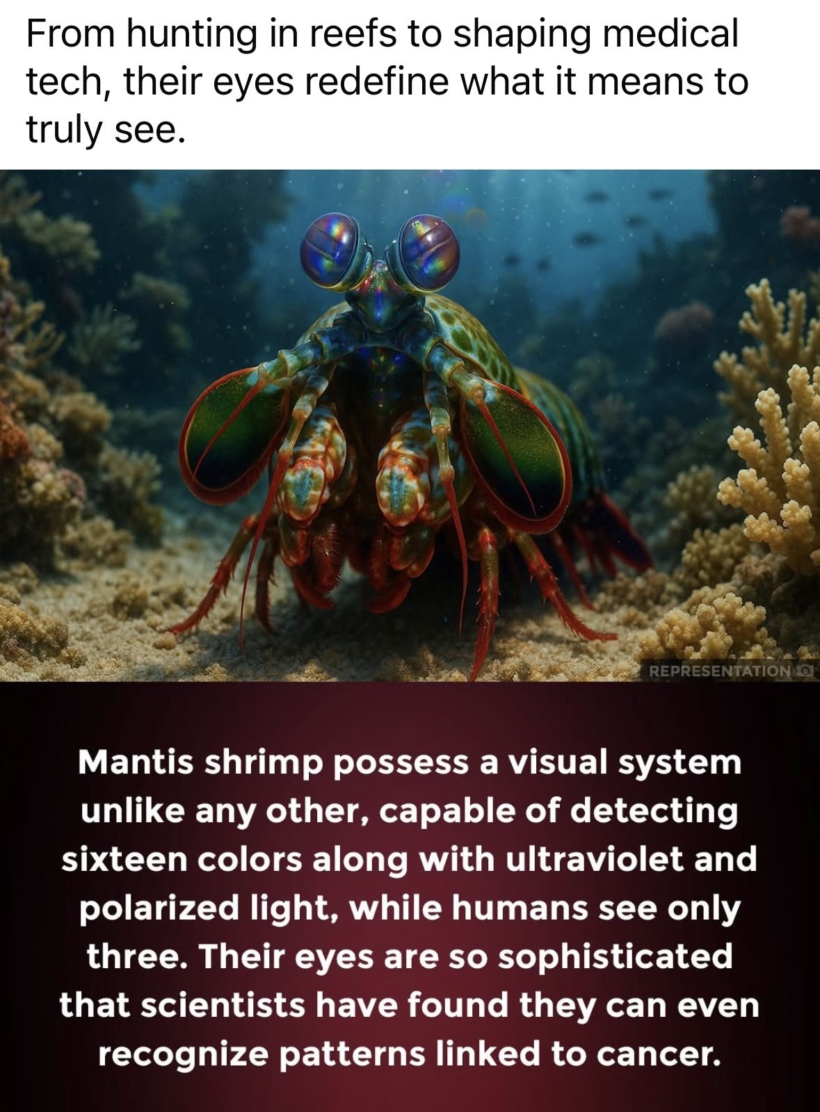 Their world is painted in colors we can’t even imagine — shimmering patterns, glowing signals, and invisible wavelengths that tell stories no human eye could see. These vibrant hunters use their incredible sight to track prey, communicate with mates, and navigate coral labyrinths with surgical precision. 🪸💥 But beyond the ocean, their eyes have inspired scientists to develop new imaging technologies that could help detect cancer cells and improve medical diagnostics — all by mimicking the shrimp’s ability to recognize complex light patterns. 🧬🔬
