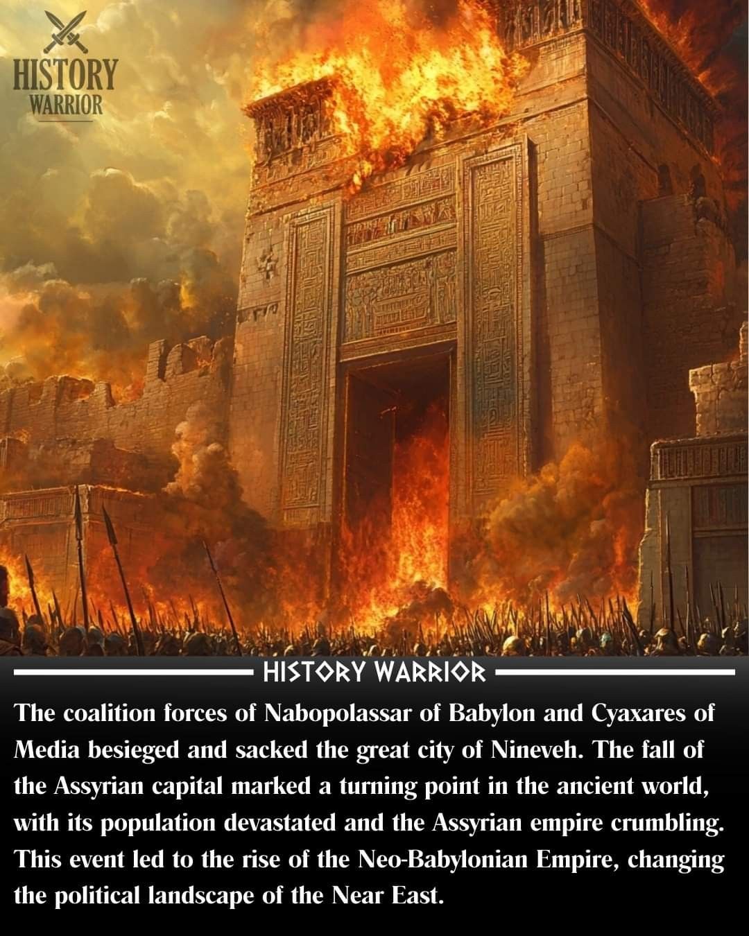 In 612 BCE, flames lit up the skies of Mesopotamia as the mighty city of Nineveh, capital of the Assyrian Empire, fell to a coalition of Babylonian and Median forces. Once the most powerful city on Earth โ a symbol of conquest, wealth, and divine kingship โ Nineveh met its end in a storm of fire, steel, and vengeance โ๏ธ๐ฅ.