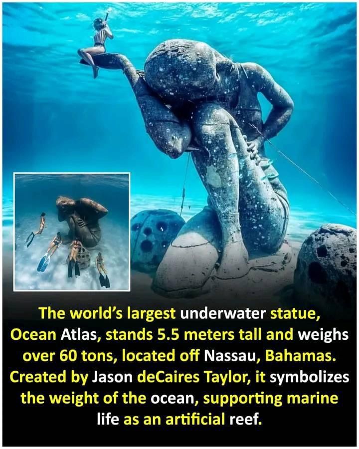 Deep beneath the turquoise waters of Nassau, Bahamas, lies a breathtaking marvel โ Ocean Atlas, the worldโs largest underwater statue. ๐๐ Standing 5.5 meters tall and weighing over 60 tons, this monumental sculpture by artist Jason deCaires Taylor portrays a young girl bearing the weight of the ocean on her shoulders, a hauntingly beautiful symbol of humanityโs relationship with nature. ๐โจ
