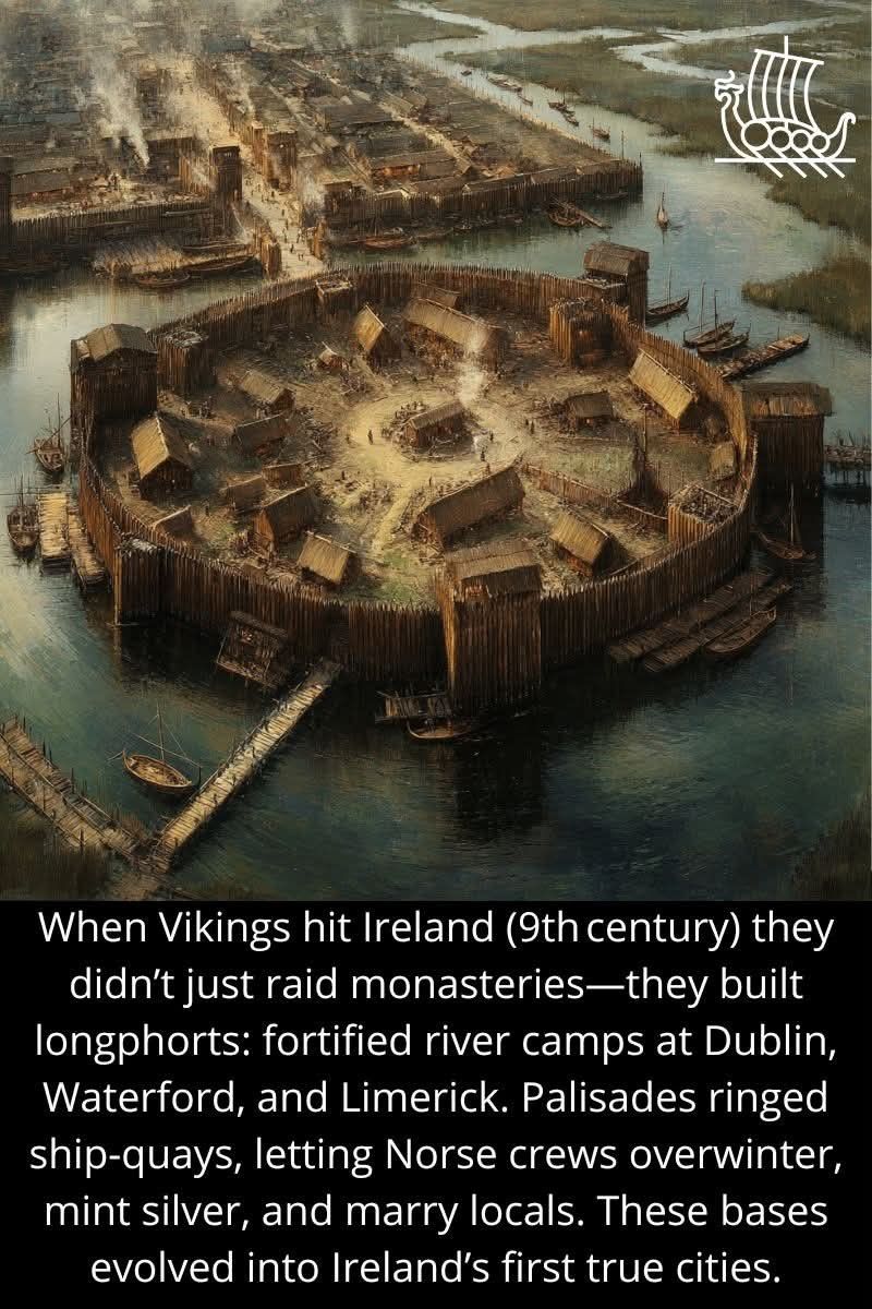 They established strongholds along the rivers — Dublin, Waterford, and Limerick — building wooden walls and docks that allowed their ships to anchor safely through harsh winters. ⚓🏕️ Inside these fortresses, life began to flourish: they minted silver coins, traded goods from across the known world, and even married into local Irish families, blending cultures and forging a new way of life. 💍💰🌍