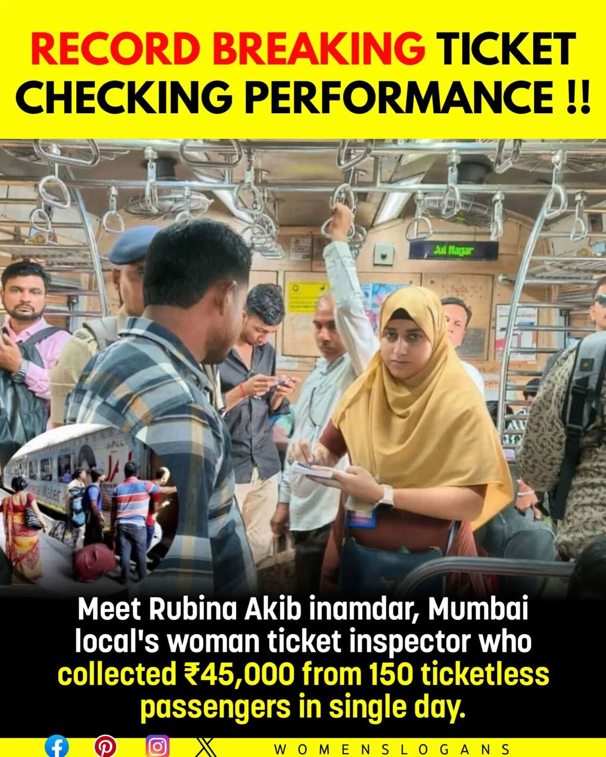 In a bustling Mumbai local train, where thousands rush through their daily commute, one woman stands tall as a symbol of dedication and discipline π. Meet Rubina Akib Inamdar, a fearless and determined ticket inspector whose incredible performance has left everyone in awe. In just one single day, Rubina managed to collect an astounding βΉ45,000 in fines from 150 ticketless passengers β a feat that not only showcases her hard work but also her unyielding commitment to fairness and responsibility ππ₯. Amidst the chaos of crowded compartments, she moves calmly yet powerfully, ensuring that every traveler respects the rules. Her presence commands respect β not through force, but through integrity, persistence, and quiet strength πΌβ¨.