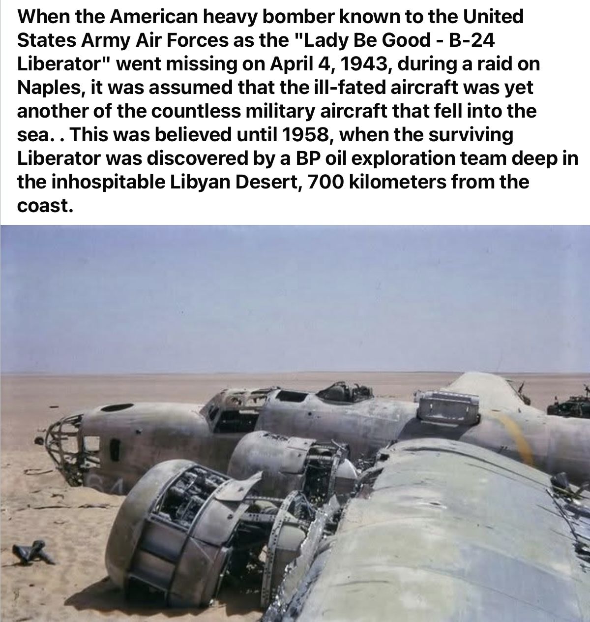In April 1943, during the chaos of World War II, an American B-24 Liberator bomber named “Lady Be Good” vanished without a trace after a raid on Naples, Italy. For years, it was believed the aircraft and its nine-man crew had plunged into the Mediterranean Sea — one more silent casualty of war. The world moved on, never realizing that the plane’s true resting place lay far from the ocean, deep within one of Earth’s most unforgiving landscapes. 🌍😔