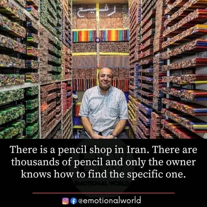 In the heart of Tehran, Iran, tucked away on a narrow street filled with everyday charm, lies one of the world’s most extraordinary shops — a tiny paradise built entirely out of pencils. From floor to ceiling, every inch of the walls glows with color: neatly stacked rows of pencils in every imaginable shade, shape, and brand. And in the middle of it all sits a man with a gentle smile — the shop’s proud owner, who knows the story of every single one. 🖋️✨
