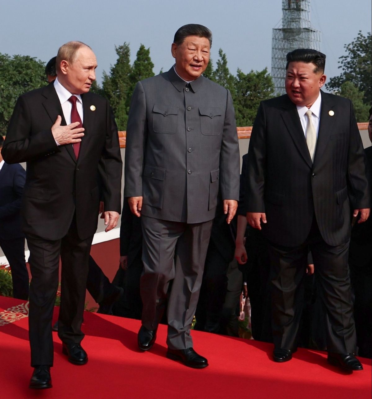 This striking image captures a defining moment in world diplomacy β three influential figures walking side by side, engaged in what appears to be a conversation that could shape the future of international relations ποΈβ¨. Dressed sharply in suits, they stride together on a red carpet β a color that symbolizes strength, formality, and historic significance π΄π. Their expressions reflect a mix of focus, respect, and strategy β each man carrying the weight of his nation, yet united in dialogue.