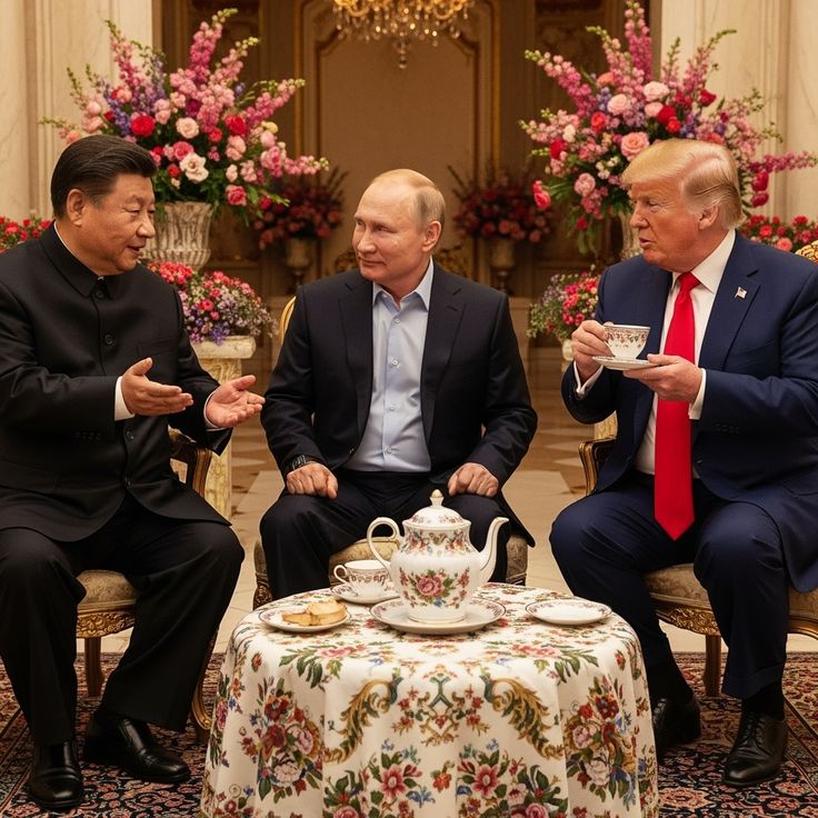 In this captivating image, three of the worldβs most powerful figures share a surprisingly serene moment β not in a grand conference hall or behind podiums, but around a beautifully set tea table adorned with elegant floral china and vibrant blooms πΈπ΅. Their expressions are calm, their gestures relaxed β a glimpse into diplomacy at its most human. Amid delicate teacups and gentle conversation, this scene transforms power into poise, and politics into presence.