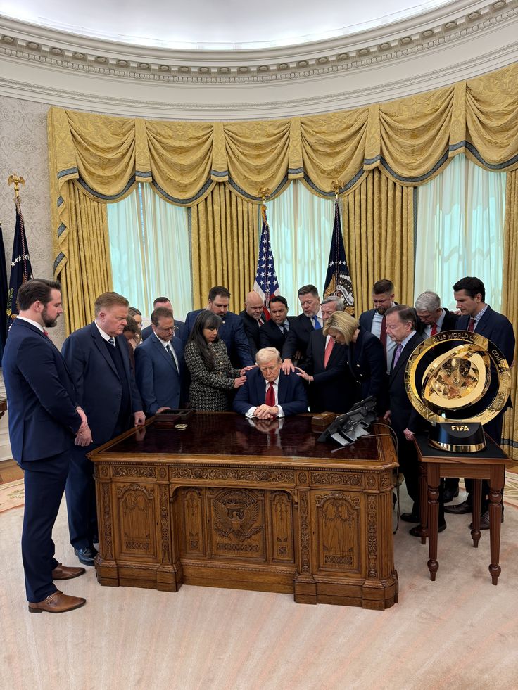 This deeply moving photograph captures a rare and emotional scene inside the Oval Office β a place where history, power, and prayer converge ποΈβ¨. At the heart of the image, the leader sits with bowed head and closed eyes, surrounded by a circle of people placing their hands gently upon him β a gesture of solidarity, strength, and faith π. The air feels reverent, as if the weight of leadership itself is being shared, lifted, and blessed by those who believe in the power of hope and unity.