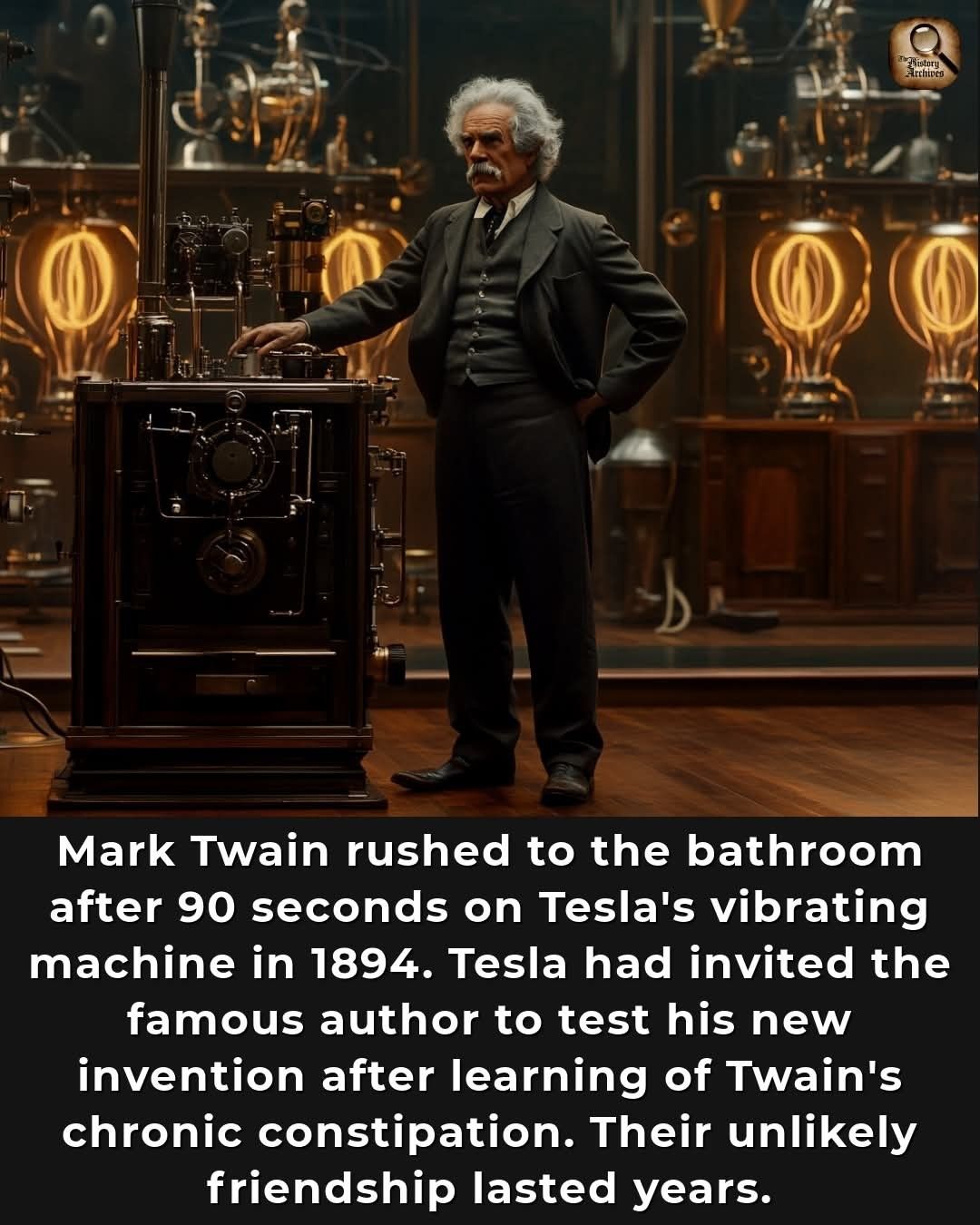 Their worlds collided in 1894, inside Tesla’s New York laboratory — a place glowing with strange machines, humming coils, and the scent of invention. Twain, who had long suffered from chronic constipation, was intrigued by Tesla’s latest device: a mechanical oscillator — a vibrating platform designed to stimulate circulation and energy flow through the body Tesla, ever the showman, invited Twain to try it. The author stepped onto the platform, fascinated by the rhythmic vibrations coursing through him. At first, he laughed, declaring that he felt “young again!” But after 90 seconds, Twain’s expression changed. Suddenly, he leapt off the machine and rushed to the bathroom — the device had quite literally “shaken things loose.” Tesla reportedly burst into laughter, remarking that the machine worked exactly as intended
