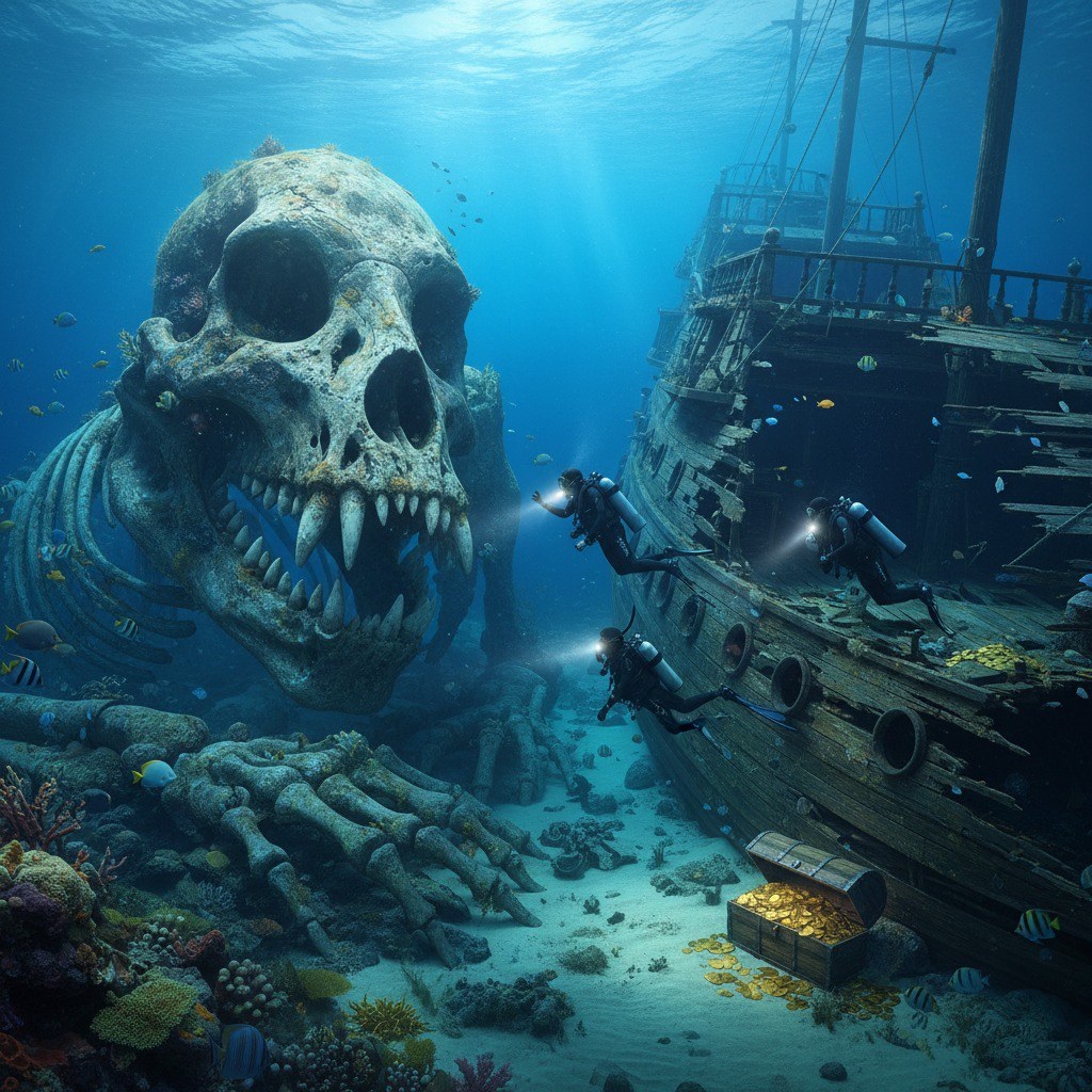 A chilling discovery off the coast of the Philippines is rewriting history and reigniting ancient fears. Divers exploring a centuries-old Spanish galleon have uncovered a vast underwater chamber—a colossal “tomb” sealed beneath layers of coral and volcanic stone. Within this eerie cavern lie bones so massive and strangely shaped that they rival the greatest predators ever known to roam the Earth. This shipwreck appears to have been deliberately positioned above the chamber, as if guarding or imprisoning something ominous beneath the waves.