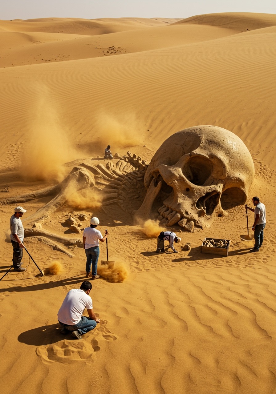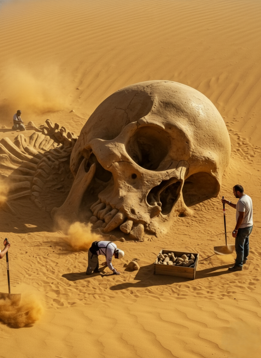 Within hours of the discovery’s leak, the excavation site was reportedly sealed off by authorities, with military-grade equipment and personnel flown in to “ensure the area’s safety.” Drones and satellite footage show large tarps covering the site, and several researchers have been reassigned without explanation. No official statement has been issued, yet documents circulating among insiders hint at accelerated genetic and radiocarbon testing — possibly under classified supervision. Meanwhile, social media has exploded with images and videos allegedly taken before the lockdown, showing a massive skull half-buried in sand and ribs protruding from the desert floor like the remains of a myth made real. The sudden silence from officials has only intensified public suspicion that this may not be a simple archaeological discovery, but rather a suppressed historical revelation.