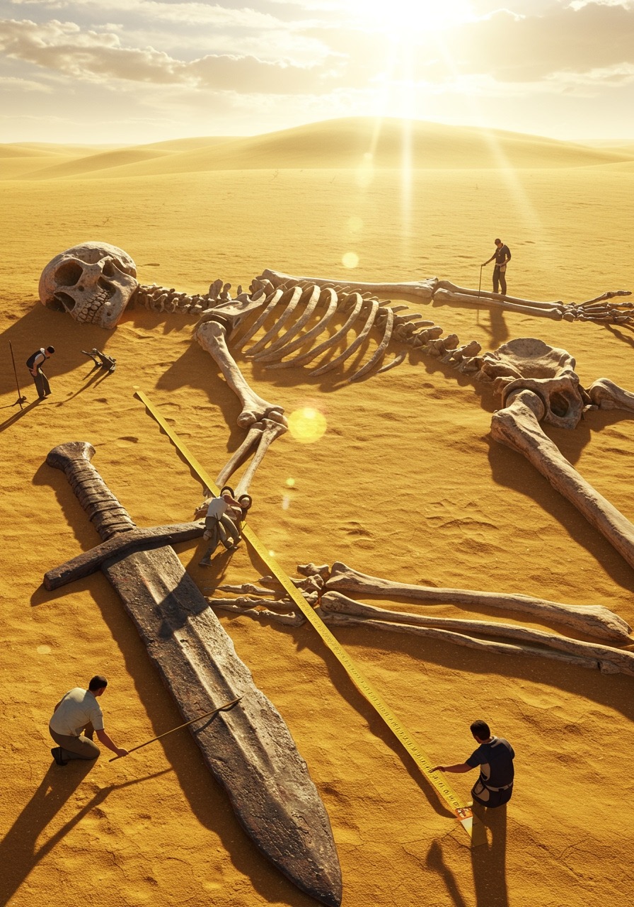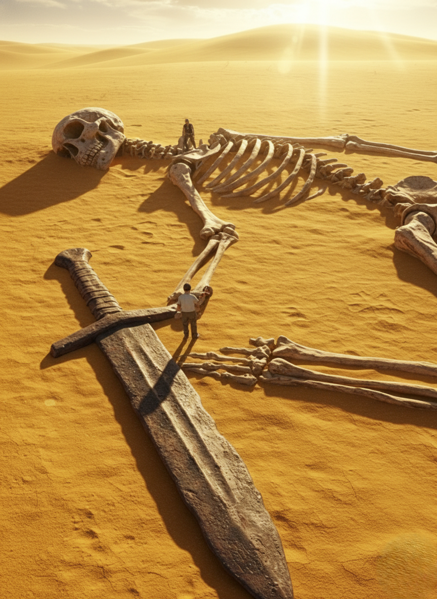 In a revelation that could rewrite the boundaries between legend and history, archaeologists have unearthed an enormous humanoid skeleton buried deep beneath the shifting sands of an isolated desert. Lying beside the fossilized remains was an equally massive sword-like artifact, its blade corroded yet unmistakably forged — proof that this being may have once wielded unimaginable strength. Early measurements estimate the skeleton to stand over twelve meters tall when complete, with bone density and composition unlike any known human or primate. “This find defies everything we know about evolution,” said one anonymous researcher, “and raises the possibility that myths of ancient giants may have stemmed from historical fact.” The skull alone, half-buried and scarred by centuries of erosion, stares blankly toward the horizon — a silent witness from a forgotten age.