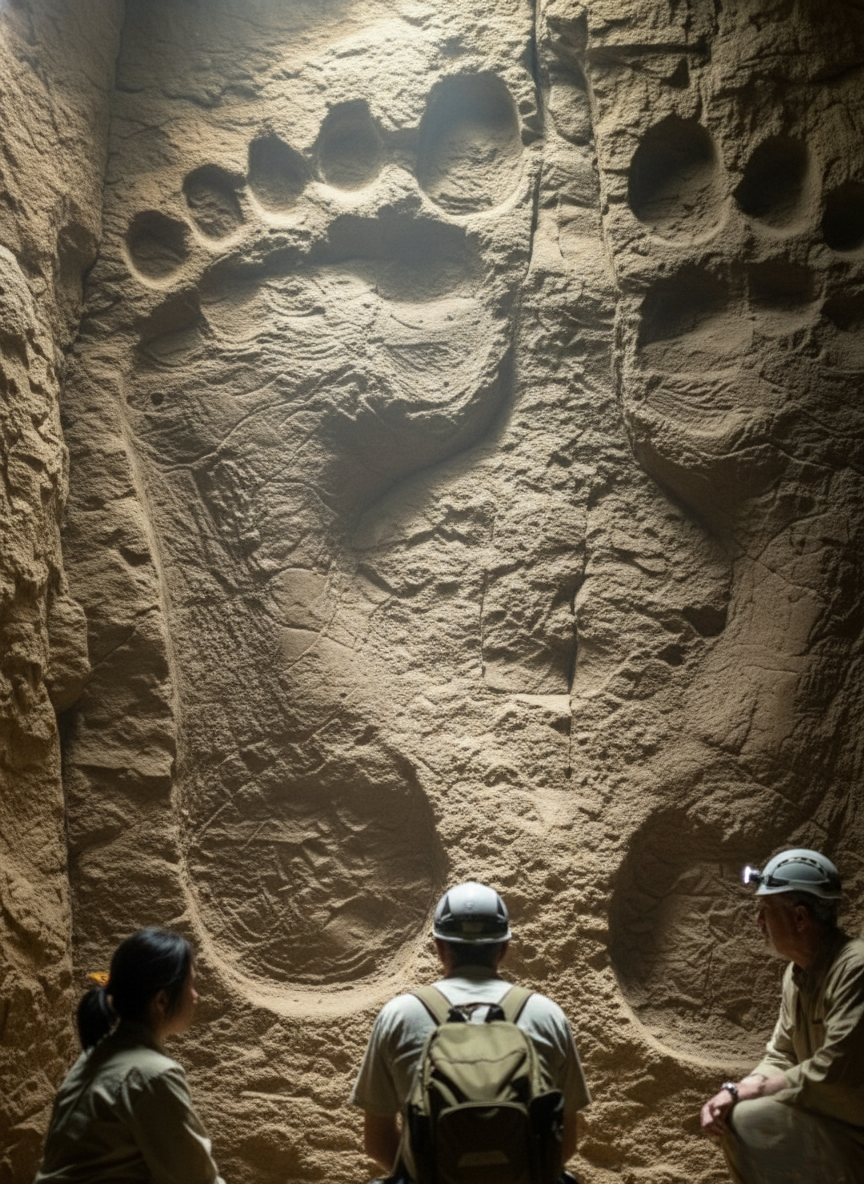 In a discovery that’s sending shockwaves through the scientific world, a team of explorers has uncovered a series of enormous, perfectly formed footprints embedded deep within the walls and floor of a remote, untouched cave system. The impressions — some stretching over two meters in length — exhibit an anatomical precision far beyond any known human or primate species. Each footprint shows distinct arches, toe separations, and even pressure depth consistent with bipedal movement, suggesting they were made by something unimaginably large — and alive. “This isn’t simple erosion or artistic carving,” one field geologist reported. “The depth, spacing, and alignment indicate weight — movement — not sculpture.” Early carbon and mineral dating suggests the prints are at least 12,000 years old, long predating known civilizations and raising impossible questions about who, or what, could have left them.