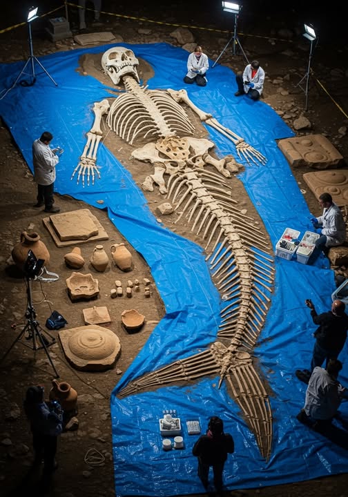 Breaking news has sent shockwaves through the scientific community: a colossal humanoid skeleton with a long, marine-like tail has been unearthed, resurrecting ancient fears and forgotten legends from the depths of the ocean. Discovered by a team of archaeologists during an expedition in a remote coastal region, the remains were found entombed beside ritual artifacts and mysterious oceanic symbols, indicating that this being was once both revered and perhaps dreaded by those who encountered it.