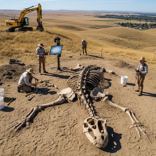 In the windswept expanses of North Dakota’s Badlands, paleontologists have made a groundbreaking discovery that has sent shockwaves through the scientific community: a colossal, near-complete prehistoric skeleton, dwarfing anything previously found in the region. Measuring over 20 feet in length, this extraordinary find suggests a creature of unimaginable scale that roamed North America millions of years ago, challenging everything we thought we knew about prehistoric life.