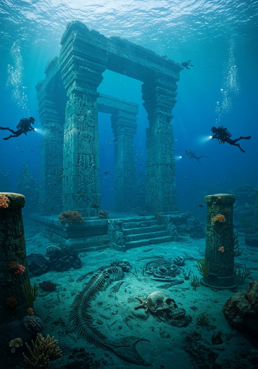 Marine archaeologists have already confirmed that the architecture of the temple predates all known maritime civilizations, and the level of craftsmanship suggests an advanced culture with deep reverence for the sea. Nearby artifacts—shell-encrusted sculptures, metallic tools, and stone tablets carved with unknown symbols—imply ritual or religious significance. Some experts believe the ruins could be linked to the legendary Atlantis, or at least to a sister civilization lost to rising seas during the last great melt. Government and research agencies have moved swiftly to restrict public access to the coordinates, citing “environmental preservation,” though insiders claim portions of the discovery have already been classified. The silence from official institutions has only intensified speculation, with leaked footage showing divers swimming past vast columns and what appears to be multiple humanoid skeletons scattered across the seabed.
