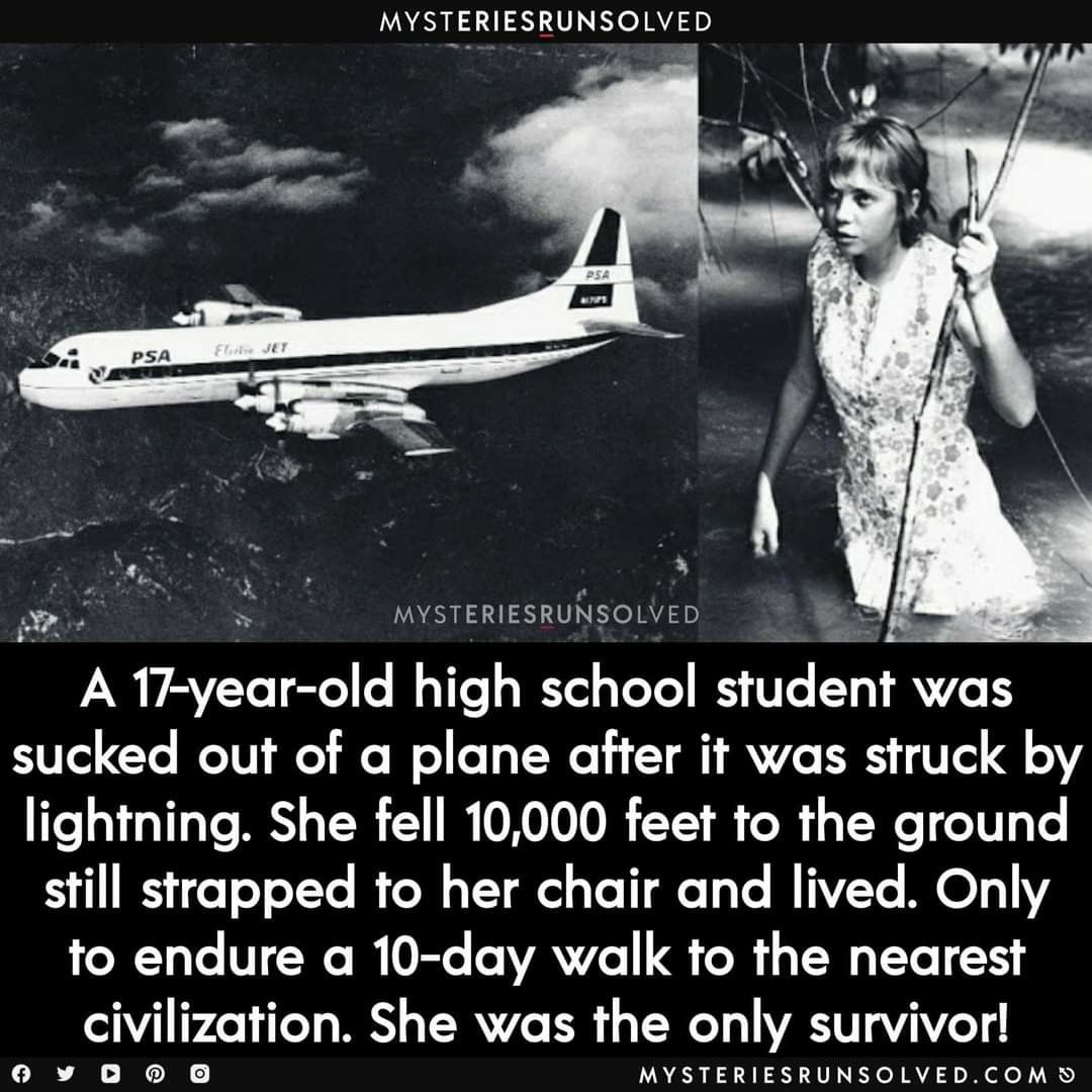 In the vast skies above the Peruvian rainforest, a teenage girl named Juliane Koepcke faced the unthinkable β a plane torn apart by lightning. At just 17 years old, she was sucked out of the aircraft and hurled toward the earth from a height of 10,000 feet. π₯π Still strapped to her seat, she plummeted through the clouds, her fall broken by the dense jungle canopy below. Against all odds, she survived β bruised, injured, but miraculously alive. πΏπ