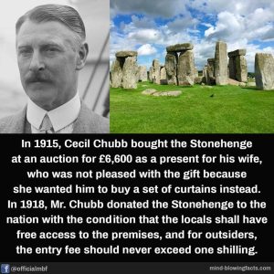 In 1915, a man named Cecil Chubb walked into an auction and made a decision that would forever change history โ and his marriage! ๐ He purchased Stonehenge, one of the worldโs most mysterious and ancient monuments, for ยฃ6,600 as a surprise gift for his beloved wife. But instead of joy, he was met with disbelief โ she had only asked for new curtains, not a prehistoric wonder! ๐๐