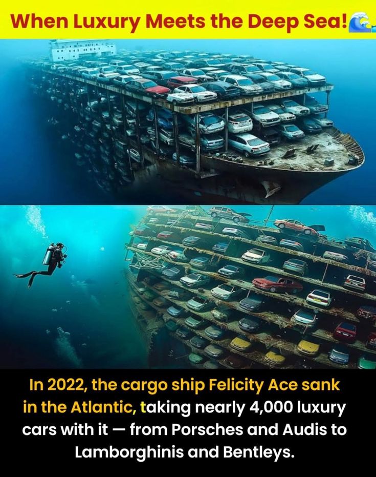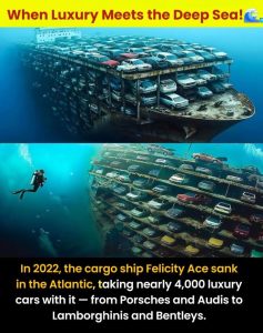 In 2022, the deep blue Atlantic claimed one of the most astonishing shipwrecks of modern times β the cargo ship Felicity Ace, a massive vessel carrying nearly 4,000 luxury cars worth over $400 million. π₯β Among them were Porsches, Audis, Lamborghinis, and Bentleys, each destined for proud owners across the globe. But fate had other plans.