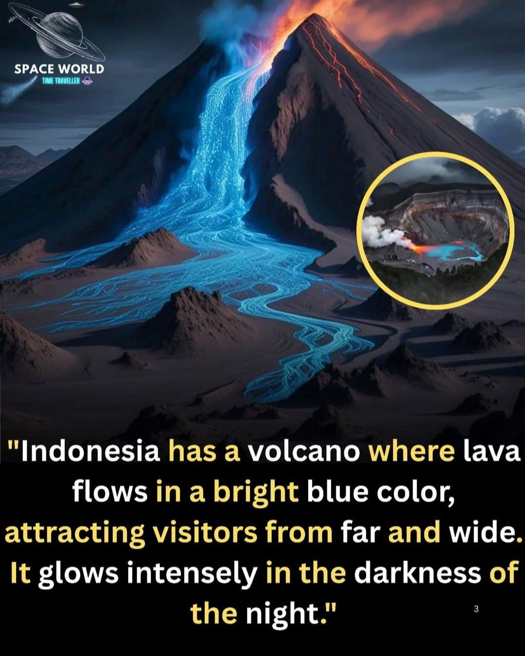 But this β€œlava” isn’t truly blue. Instead, the phenomenon occurs when sulfuric gases from deep within the volcano escape through cracks and ignite when exposed to oxygen. The burning sulfur produces intense blue flames, some soaring up to 5 meters high, creating a surreal river of light flowing down the mountain. πŸ’™πŸ”₯
